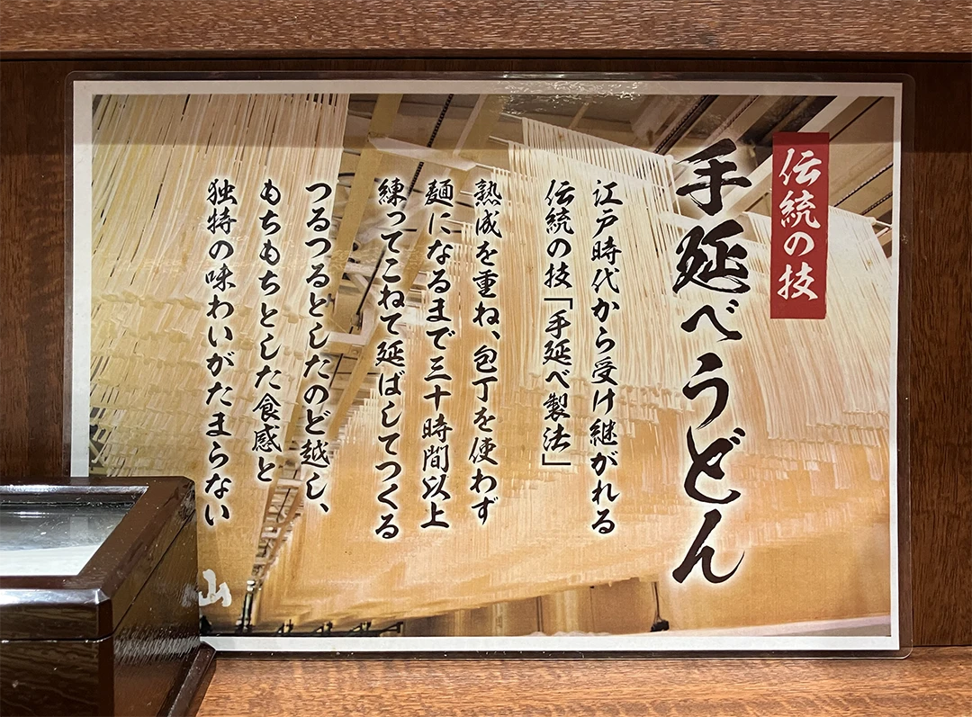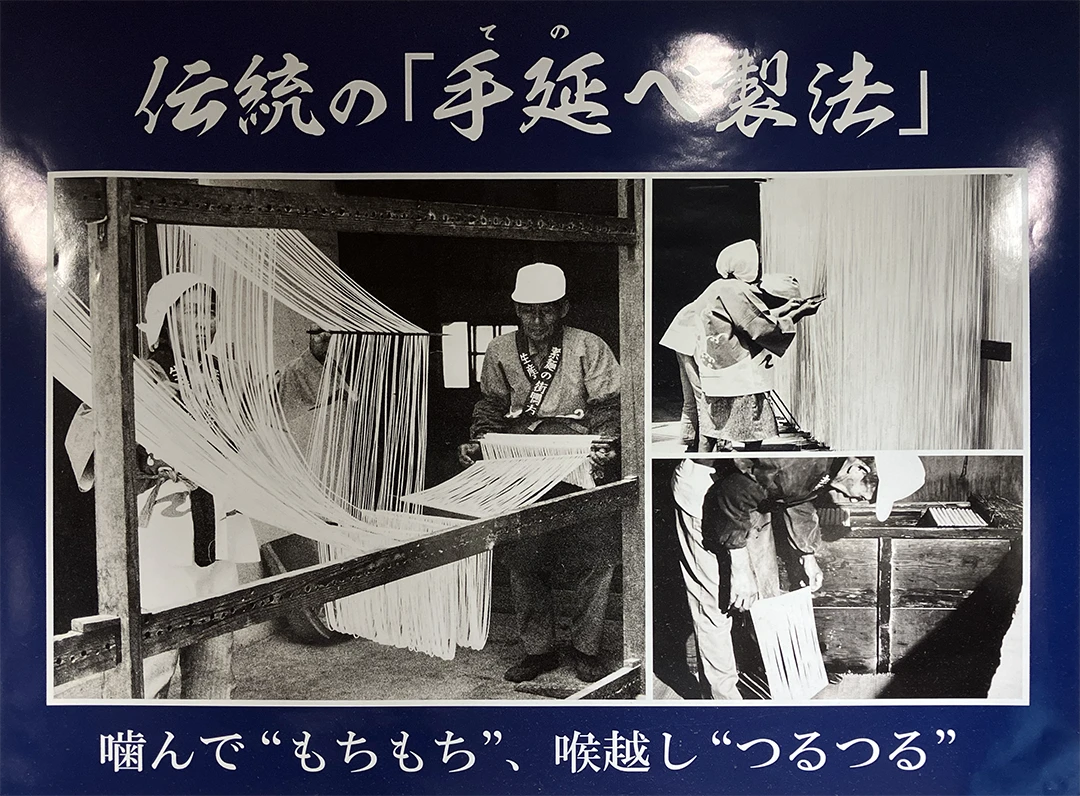 ちなみに水山は、これまであまり意識していませんでしたが、下の写真にあるように、昔ながらの製法で製造まで30時間以上かけるなど、かなりの手間をかけた手延べうどんを提供しているようです。